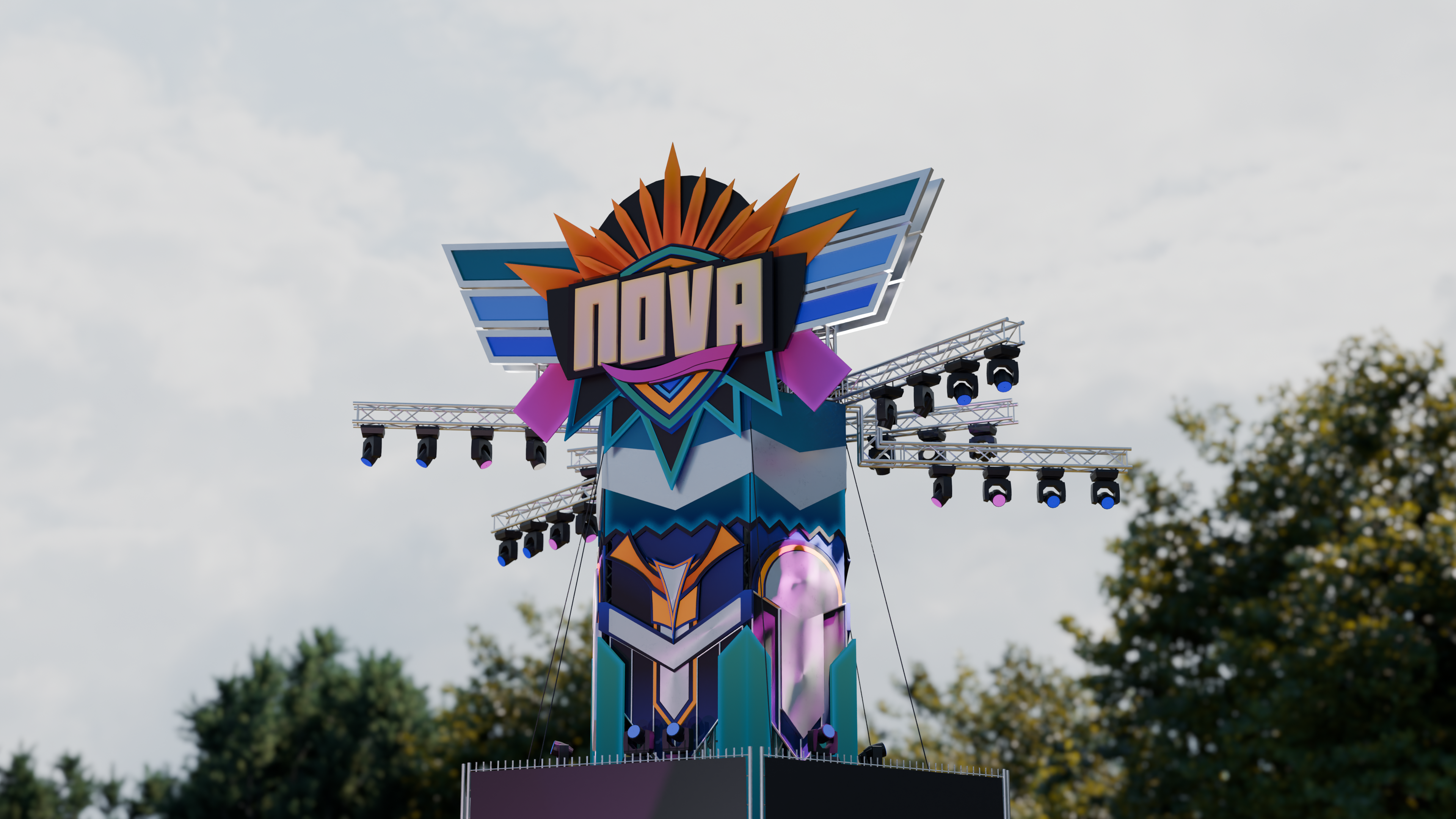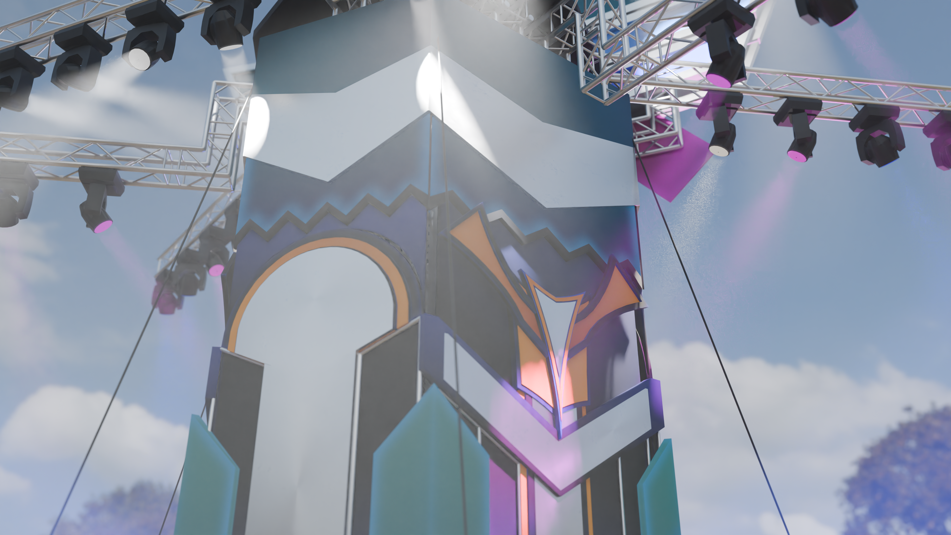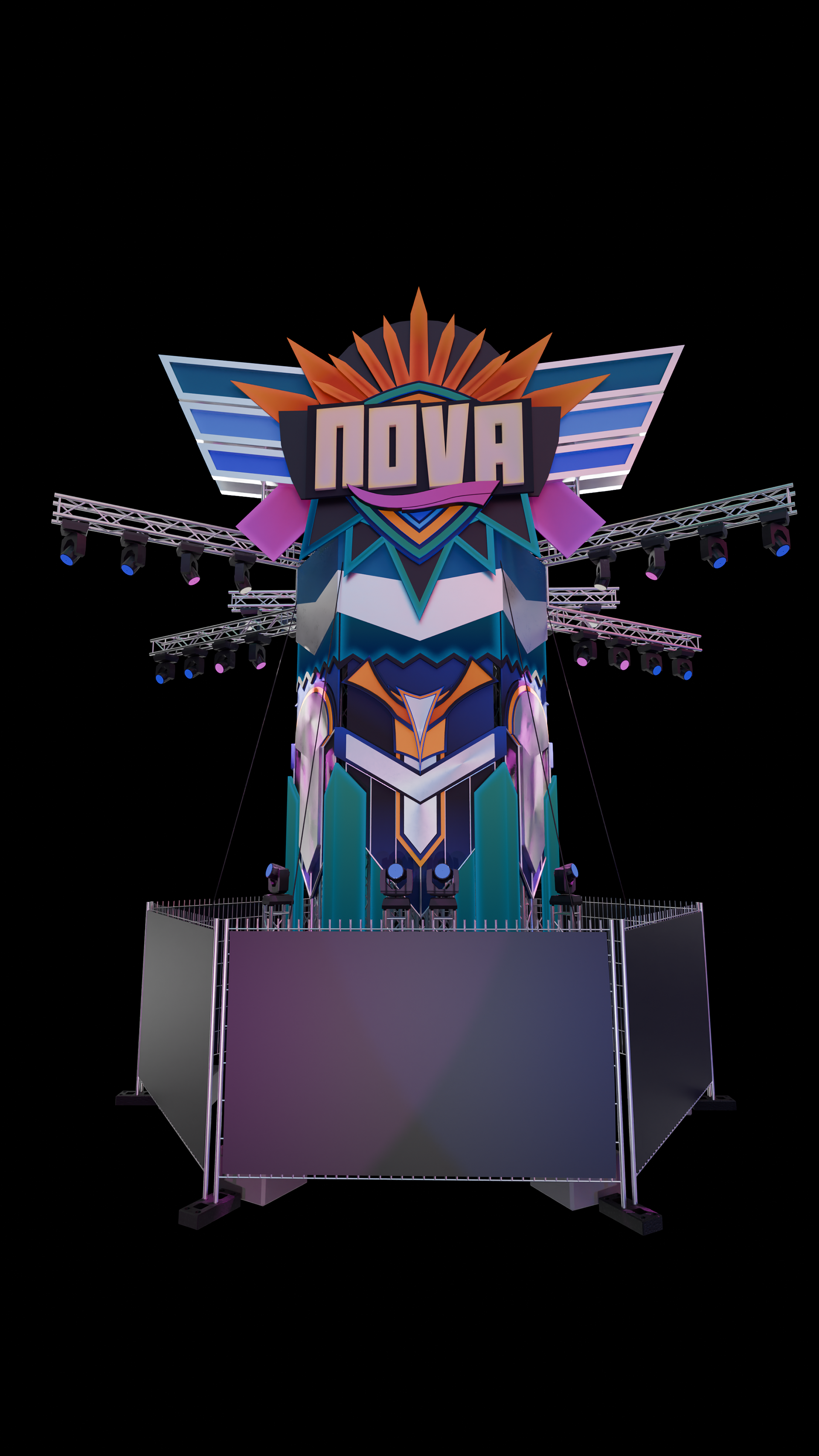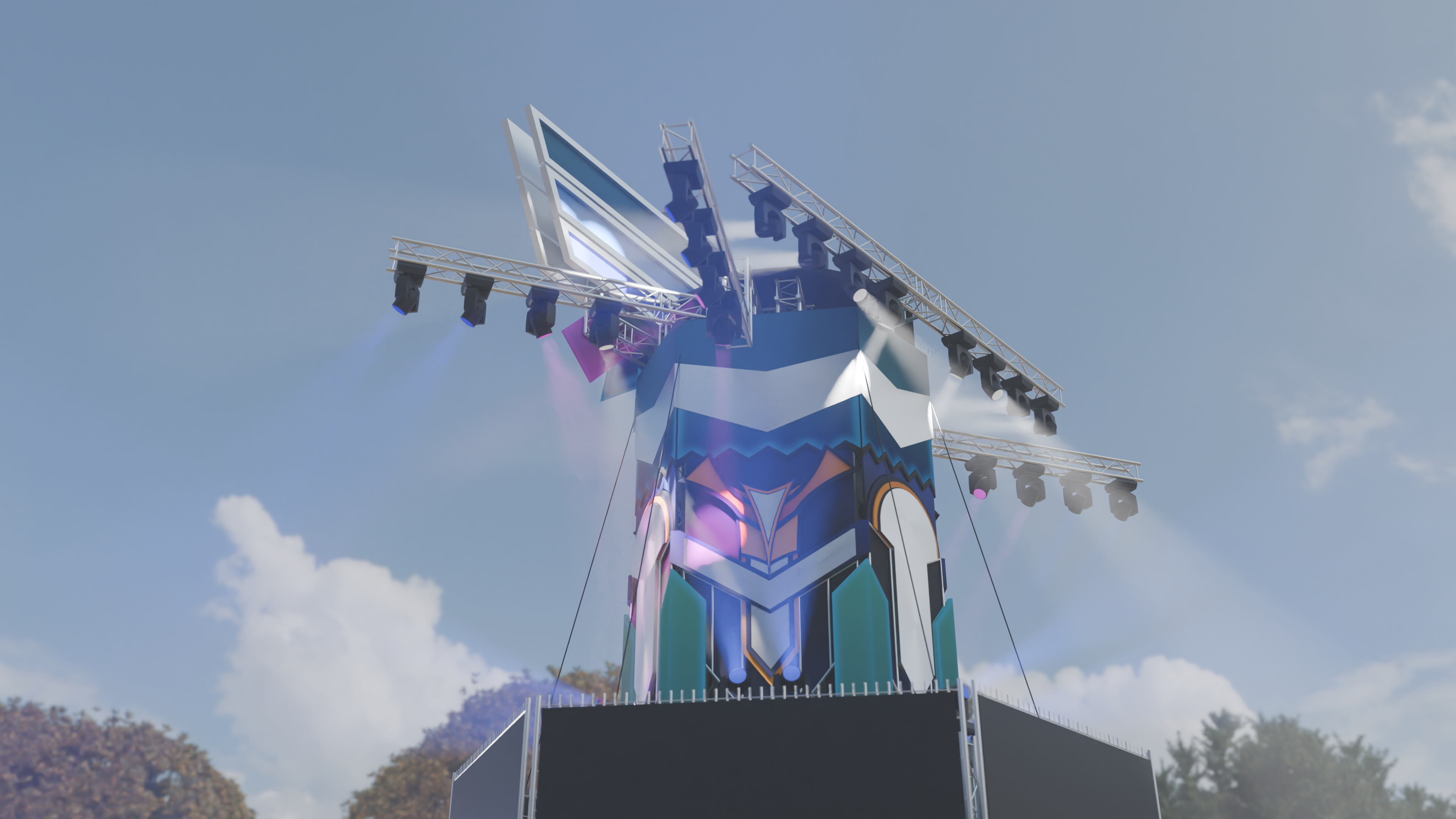 Conceived as a central scenographic element, this totem naturally draws the eye, structures the space, and strengthens the visual identity of the event, whether in a festive, musical, or artistic context.