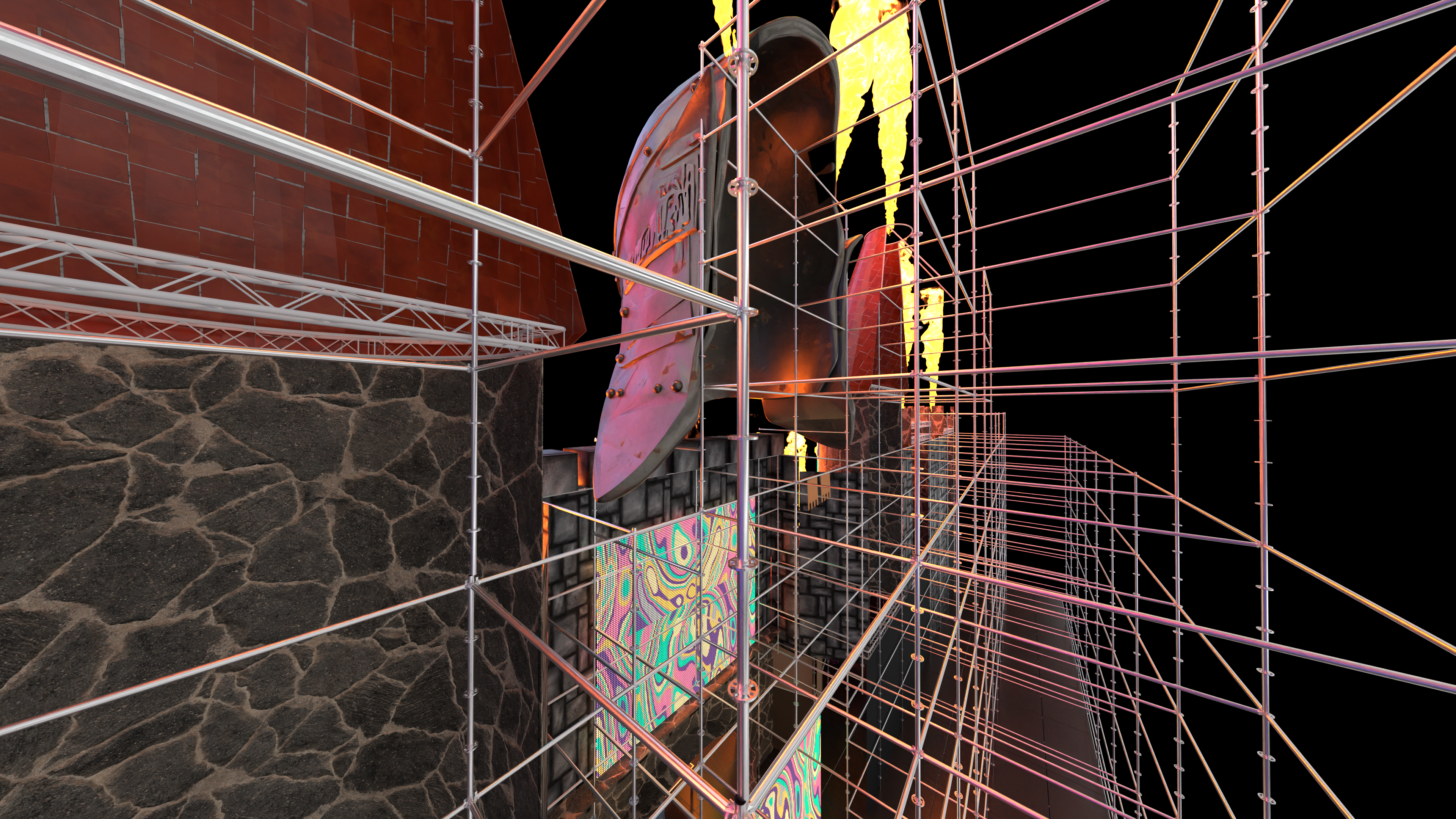 Conceived to integrate seamlessly with a Layher structure, this scenography combines strong visual impact with technical efficiency. Each element is designed in a modular way, allowing for quick attachment to the structure and ensuring a smooth, safe, and optimized setup, without compromising aesthetics.