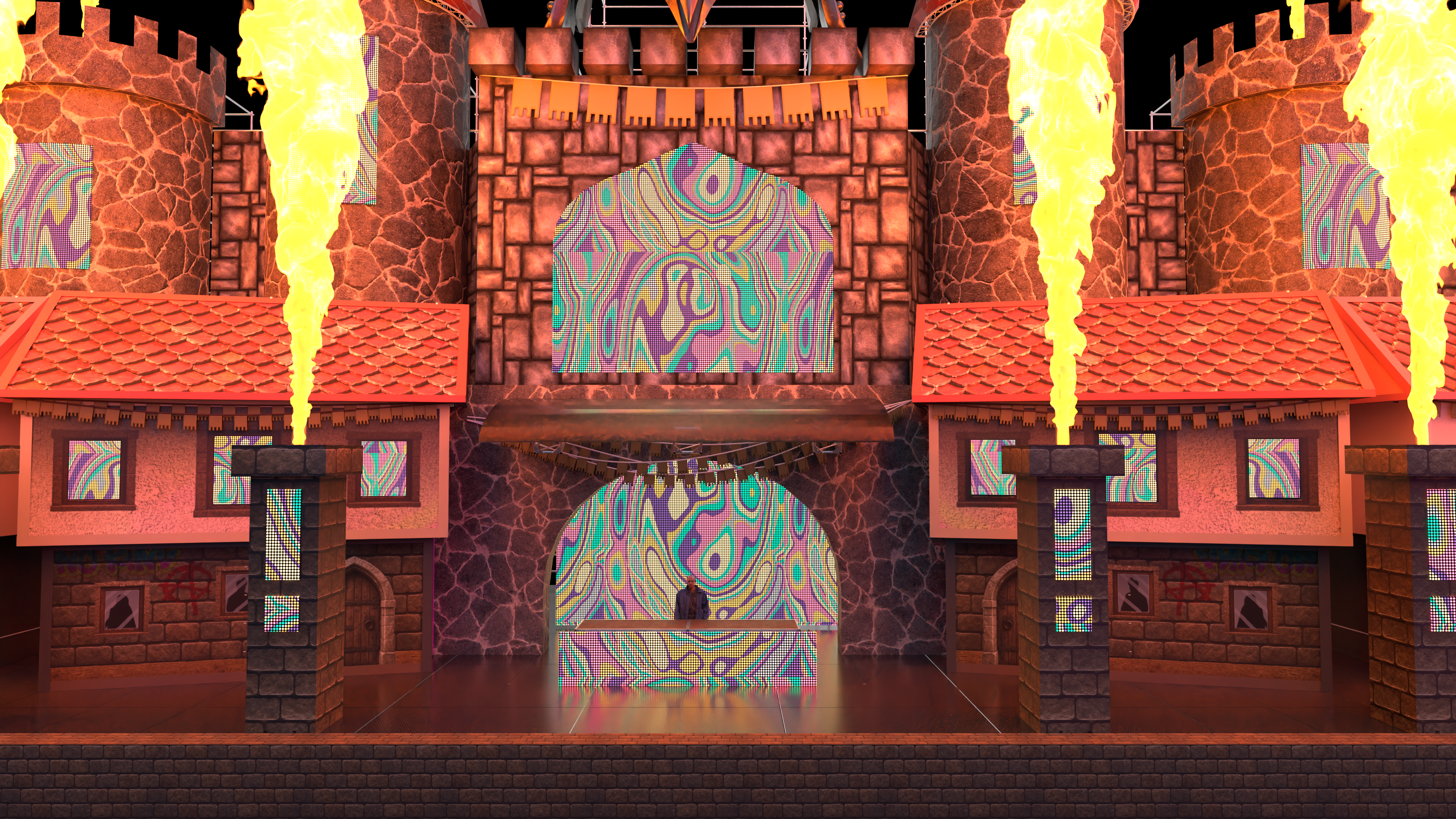 A monumental stage inspired by sacred architecture, where fire becomes a scenographic element in its own right.